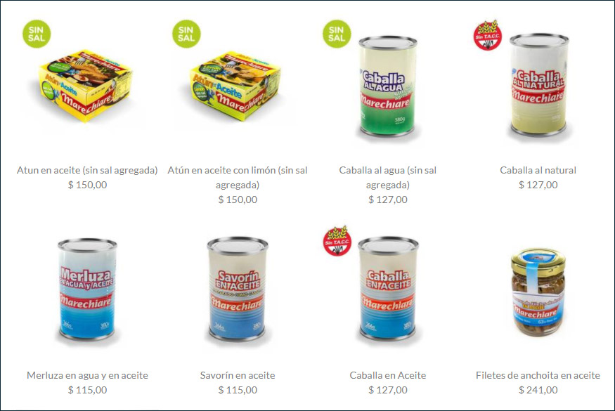 La tienda virtual incluye caballa al natural, al agua (sin sal agregada) o en aceite. Naturalmente, también se ofrecen anchoíta, calamar y una variedad de atúnes, entre otras opciones. La idea es ofrecerle al consumidor una alternativa de compra.