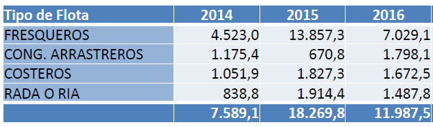 Evolución entre 2014 y 2016, según tipo de flota. Fuente: Inidep.