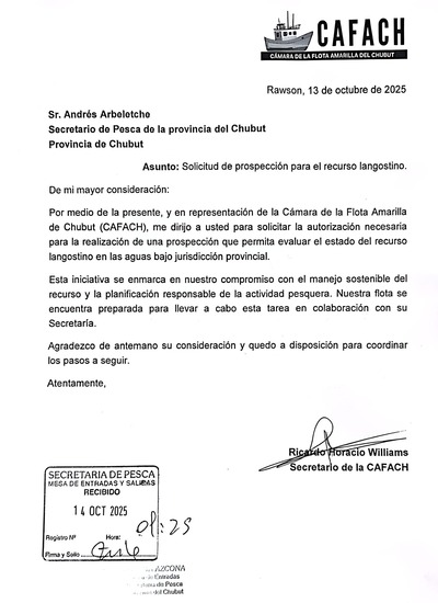 La Cámara de la Flota Amarilla de Chubut (CAFACh) solicitó oficialmente a la Secretaría de Pesca provincial, encabezada por Andrés Arbeletche, la autorización para realizar la prospección del langostino (Pleoticus muelleri) en aguas bajo jurisdicción de la provincia.