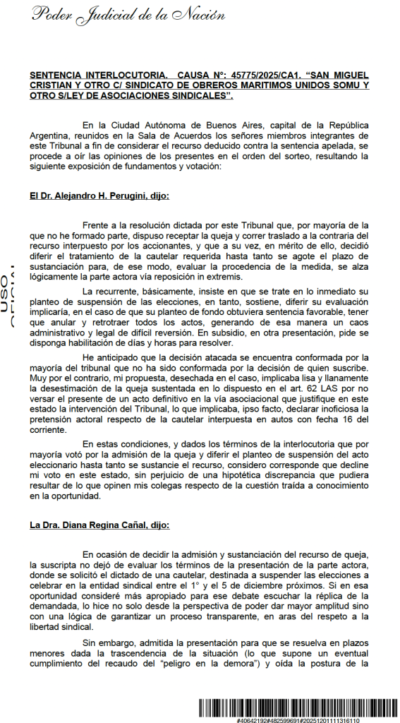 En un giro que sacudi贸 por completo el clima interno del Sindicato de Obreros Mar铆timos Unidos (SOMU), la C谩mara Nacional de Apelaciones del Trabajo resolvi贸 suspender las elecciones que estaban en curso desde la ma帽ana de hoy 1 de diciembre y hasta el 5 de diciembre, luego de analizar una presentaci贸n cargada de denuncias, actas notariales y acusaciones cruzadas entre el oficialismo y dos listas opositoras.