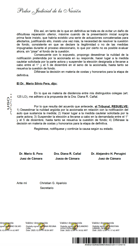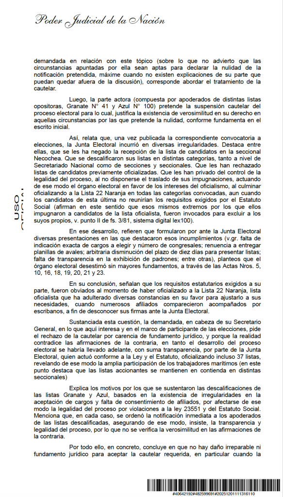 La medida, de car谩cter cautelar e inmediata, fue votada por mayor铆a, con adhesi贸n de los jueces Diana R. Ca帽al y Mario S. Fera, quienes entendieron que, de continuar el proceso electoral tal como estaba planteado, podr铆a producirse un da帽o de dif铆cil reparaci贸n para la vida institucional del gremio mar铆timo.