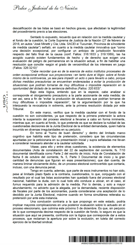 El fallo tambi茅n env铆a un mensaje claro a todo el universo sindical, la Justicia est谩 dispuesta a intervenir cuando encuentra indicios concretos de que un proceso electoral podr铆a violar garant铆as b谩sicas.