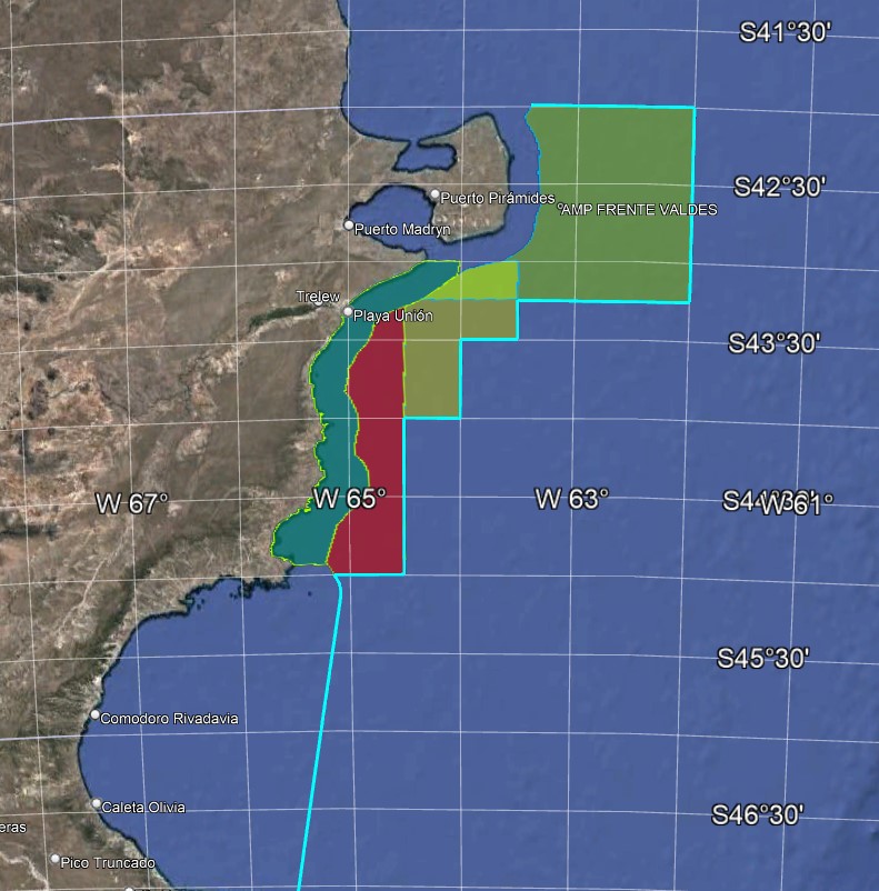 De esa manera, la pecera donde pesca la flota de Rawson (verde) quedaría blindada a sus intereses, y alejada desde la milla 12 a una línea imaginaria (celeste) al Norte (desde donde ingresa a desovar y reproducir el langostino), por el AMP frente Valdés, al Este por el AIER y al sur por el Golfo San Jorge. Plin caja, negocio redondo.! Alejar toda la competencia del resto de la flota tangonera para garantizar sus capturas. (Al Este de la línea celeste). Algo que va contra el permiso de pesca que posee la flota de aguas nacionales, ya que expresamente es desde la milla 12 hasta la 200 los faculta a la captura de la especie, siempre que el INIDEP, considere en condiciones biológicas de hacerlo.