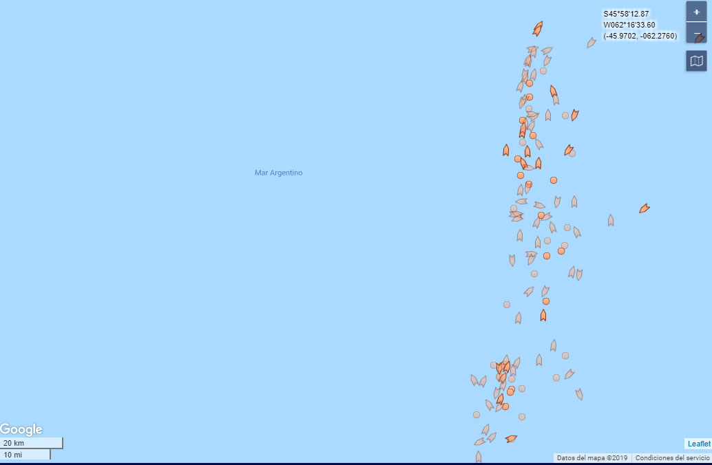 Hoy la flota extranjera se concentra frente al Golfo San Jorge en busca del calamar, operan poteros, pero también arrastreros que capturan otras especies. La imagen que devuelve el control satelital marca un notable contraste con el Mar Argentino, prácticamente vacío por el receso de fin de año.
