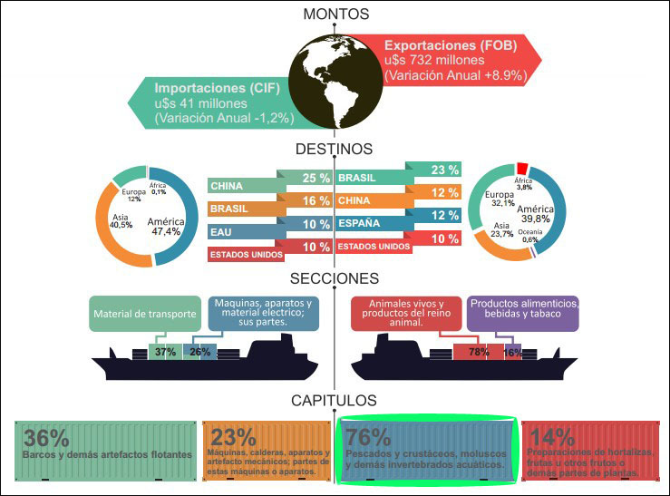 Esto considerando dos categor铆as directamente asociadas: 鈥減escados y crust谩ceos, moluscos y dem谩s invertebrados acu谩ticos鈥 (553, 7 millones) y 鈥減reparaciones de carne, de pescado o de crust谩ceos, moluscos, dem谩s invertebrados acu谩ticos鈥 (7,5 millones).