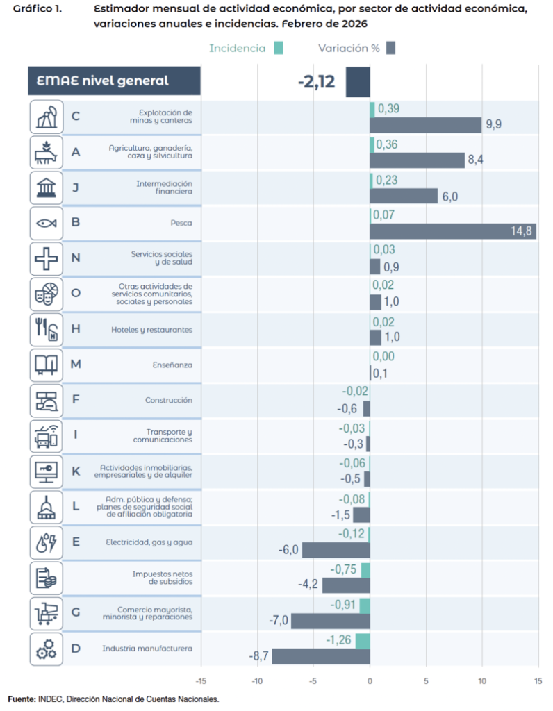 El EMAE evidenció en febrero una baja del 2,1% interanual y un retroceso del 2,6% respecto de enero en términos desestacionalizados.