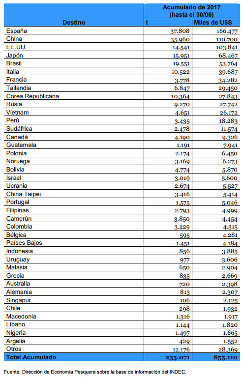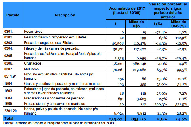 El complejo pesquero se ubicó en la octava posición durante el primer semestre de este año. El envío de 235.071 toneladas de pescados y mariscos a cambio de 855 millones de dólares le permitió estar por encima del biodiésel, la uva, el maní y el aluminio, entre otros.
