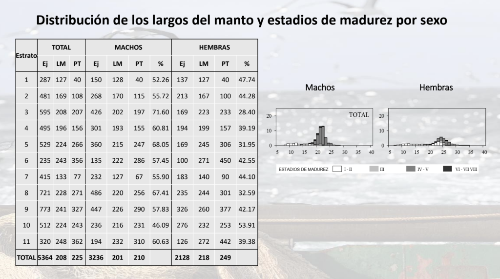 Los datos biológicos obtenidos por observadores a bordo de 12 embarcaciones permitieron caracterizar la estructura poblacional del calamar capturado. Durante abril y mayo, los ejemplares presentaban longitudes de entre 17 y 34 cm de largo de manto (LM), en su mayoría en estados de maduración o madurez incipiente, lo que permitió identificar el recurso como perteneciente al stock bonaerense-norpatagónico (SBNP). En las muestras de junio se registró una segunda cohorte, con individuos más pequeños e inmaduros, también correspondientes al SBNP.