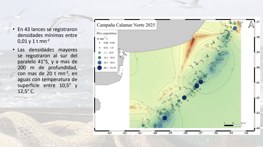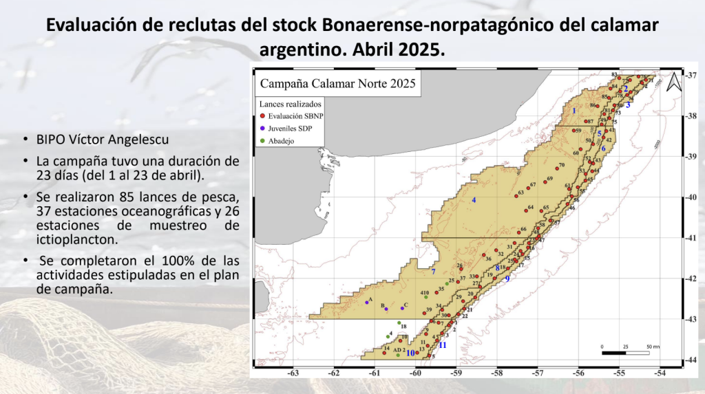En paralelo, el informe técnico del INIDEP presentó los resultados de la campaña de investigación llevada a cabo entre el 1 y el 23 de abril a bordo del BIP Dr. Víctor Angelescu, en un área delimitada entre los paralelos 37°S y 44°S, y entre las isobatas de 80 a 500 metros. El relevamiento, que se completó sin inconvenientes, permitió estimar un reclutamiento récord: 101.360 toneladas de biomasa y 383 millones de individuos, las cifras más altas registradas en los siete cruceros realizados desde el año 2000. El 98% del calamar capturado durante la campaña fue clasificado como SBNP.