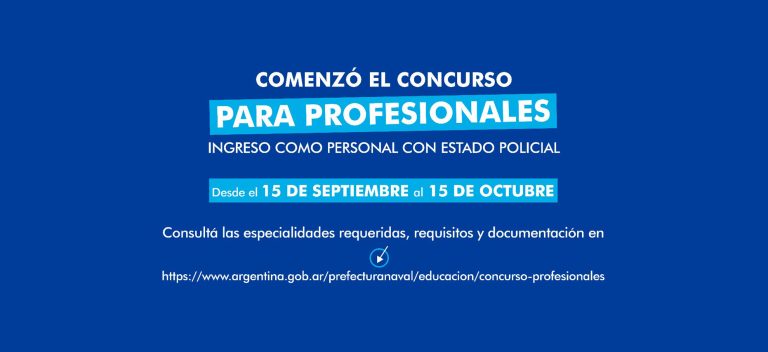 Una nueva convocatoria se abri贸 a partir del d铆a de ayer y hasta el 15 de octubre, por parte de la Prefectura Naval Argentina. Est谩 destinado a profesionales e ingresar谩n como personal con estado policial con el grado de oficial principal.