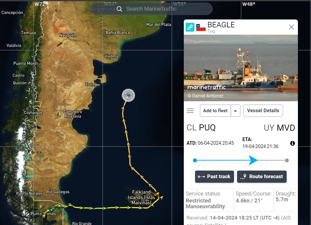 El remolcador había zarpado desde el puerto de Punta Arenas, para trasladar al An Fong No.136, buque potero que opera bajo licencia de pesca de las Islas Malvinas en aguas aledañas. Por circunstancias que se intenta conocer, el buque necesitaba ser trasladado sin propulsión hacia el puerto de Montevideo donde el mismo tiene asiento transitorio, para su posterior reparación. En su transito dentro de la ZEEA fueron interceptados por el GC-28 Prefecto Derbes.