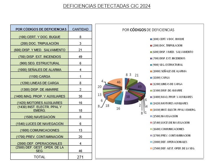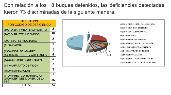Entre las falencias más frecuentes se encontraron fallos en dispositivos de extinción de incendios, problemas en la gestión de la seguridad operacional, fallos en las máquinas de propulsión y equipos de salvamento, además de incumplimientos en las medidas para prevenir la contaminación.