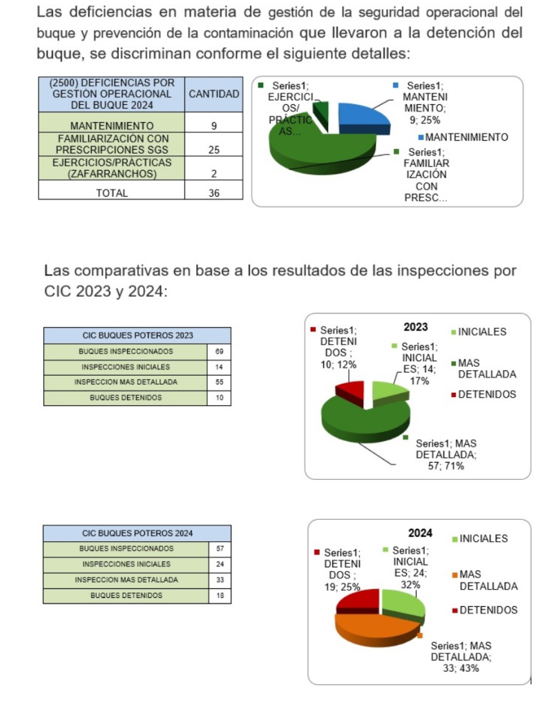 Sin embargo, los resultados muestran un avance en comparación con el año anterior: en 2023, el 79% de los buques inspeccionados presentaba deficiencias, mientras que en 2024 esa cifra bajó al 57%, con un aumento significativo en el número de buques sin observaciones.