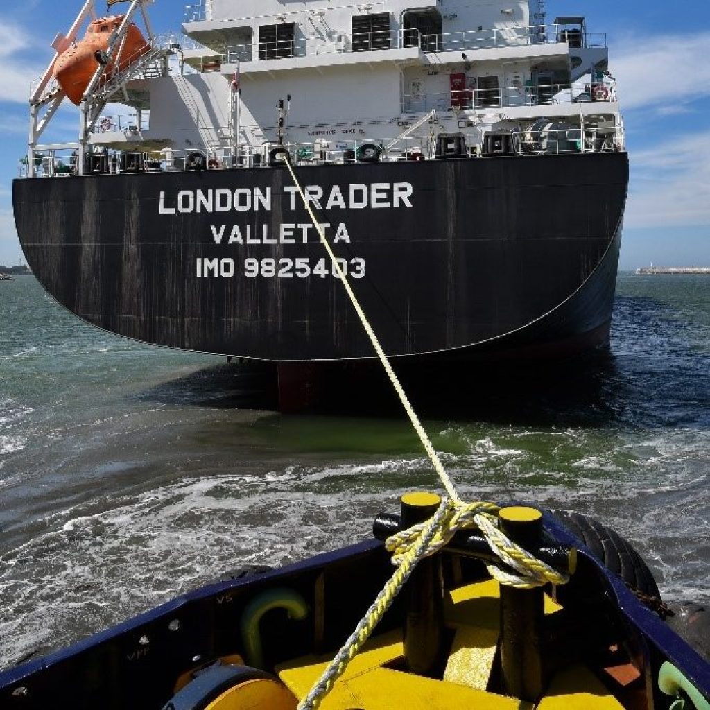 Siempre entra con dos remolcadores, uno de proa y uno de popa. En el caso nuestro al remolcador de popa, le suele tocar hacer más fuerza a la hora de girar el barco, ya que el barco entra proa adentro y hay que amarrarlo proa afuera y girarlo.