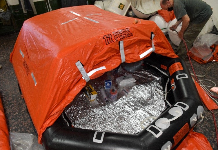 Por ello queremos a través de PESCARE mostrar aspectos, muchos de ellos desconocidos o poco difundidos de lo que significa tener una balsa a bordo y que ésta se encuentre en óptimas condiciones y con todos los elementos que requiere la autoridad de aplicación bajo las normativas que marca la OMI. Tuvimos la ocasión de introducirnos en una de ellas, junto a nuestro fotógrafo Martín Garay, con quien durante varios minutos permanecimos dentro de la balsa para poder vivenciar, por ejemplo. la sensación del cambio inmediato de temperatura que se incrementa rápidamente una vez que se cubren los flancos por los que se accede.