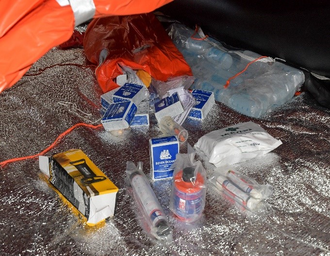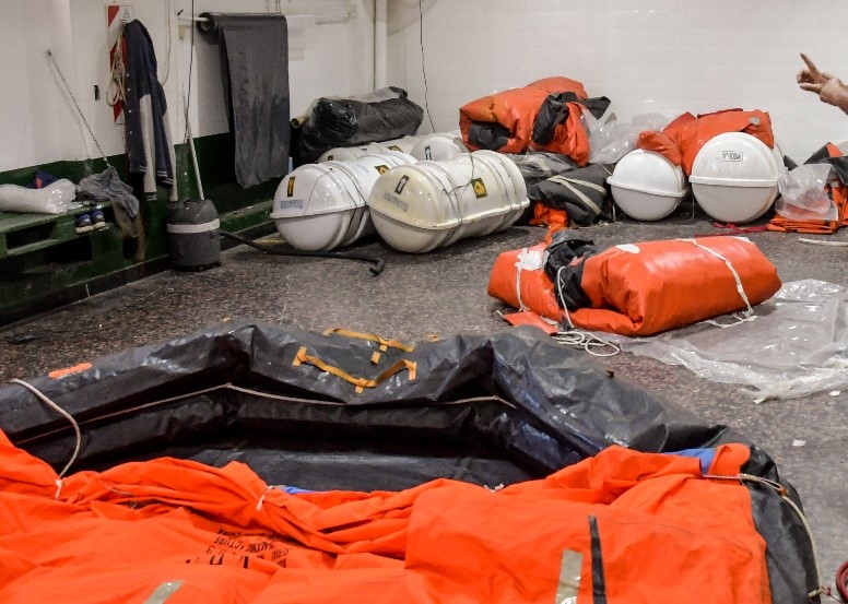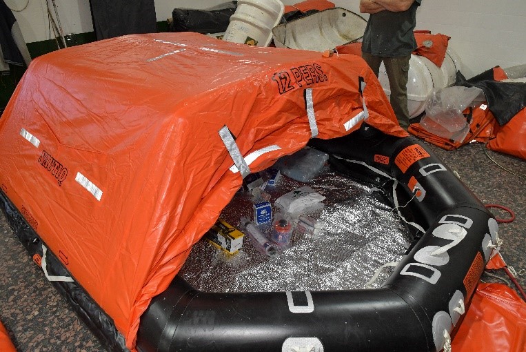 Cada una de las balsas, entre distintos elementos, cuenta con una luz que se enciende mediante un dispositivo que al tomar contacto con el agua, hace que se encienda esa luz. Además cuentan con ayudas térmicas, equipo de pesca, equipo de reparaciones, un inflador, pirotecnia, raciones de agua, raciones de comida, un botiquín, pastillas anti mareos, remos, un ancla de capa de repuesto (ya que en uno de sus extremos cuenta con una adosada), una tabla de acción inmediata (instrucciones básicas) que solicita la PNA, linterna, pilas, achicadores. Cada uno de los elementos se encuentra sellado para evitar el ingreso de agua o humedad.