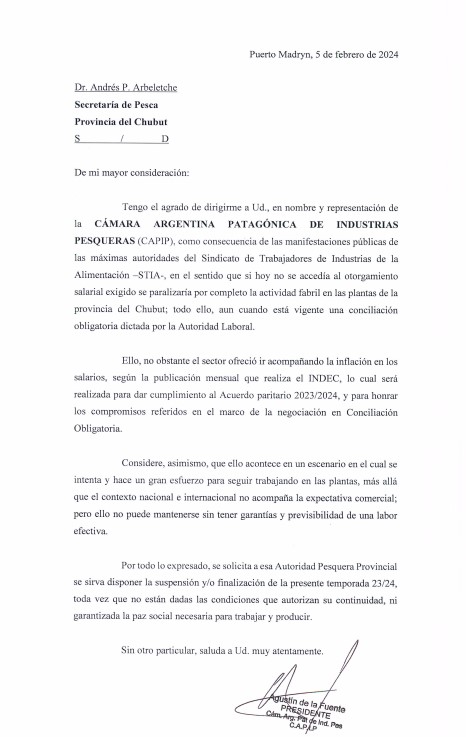 Por todo lo expresado, se solicita a esa Autoridad Pesquera Provincial se sirva disponer la suspensión y/o finalización de la presente temporada 23/24, toda vez que no están dadas las condiciones que autorizan su continuidad, ni garantizada la paz social necesaria para trabajar y producir.”