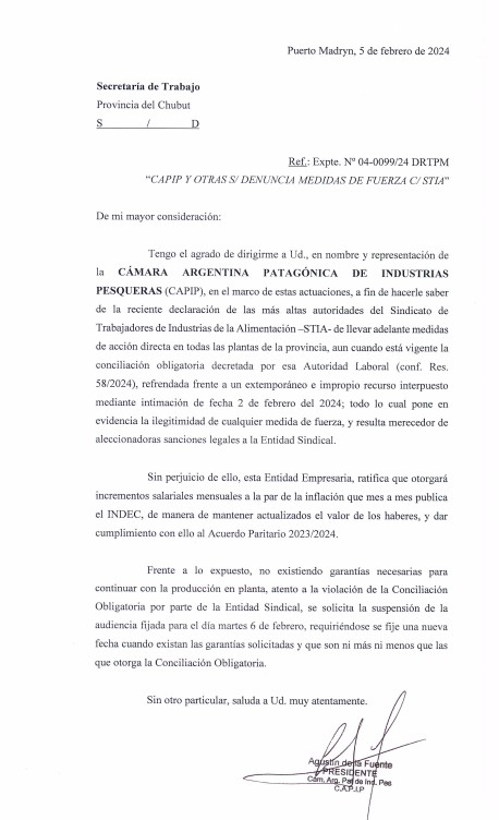 Ante esta situación la Cámara Argentina Patagónica de Industrias, envió una nota a la Secretaría de Trabajo chubutense, donde expresa que “en el marco de estas actuaciones, a fin de hacerle saber de la reciente declaración de las más altas autoridades del Sindicato de Trabajadores de Industrias de la Alimentación -STIA- de llevar adelante medidas de acción directa en todas las plantas de la provincia, aun cuando está vigente la conciliación obligatoria decretada por esa Autoridad Laboral (conf. Res. 58/2024), refrendada frente a un extemporáneo e impropio recurso interpuesto mediante intimación de fecha 2 de febrero del 2024; todo lo cual pone en evidencia la ilegitimidad de cualquier medida de fuerza, y resulta merecedor de aleccionadoras sanciones legales a la Entidad Sindical.