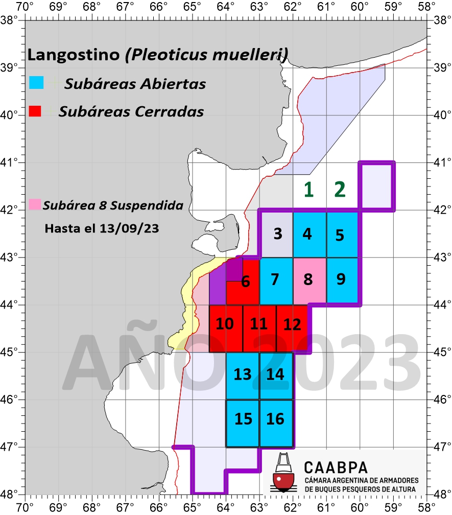 La novedad llegó en las primeras horas de la tarde del lunes a través de una comunicación de la Dirección Nacional de Coordinación y Fiscalización Pesquera, la cual envió al Departamento Policía Auxiliar de la Prefectura Naval Argentina -a cargo del Prefecto Principal Ángel Oscar Alvarenga– la apertura de las subáreas 13 y 14 dentro de la mencionada Área de Veda Permanente de Juveniles de Merluza, para la pesca de Langostino.