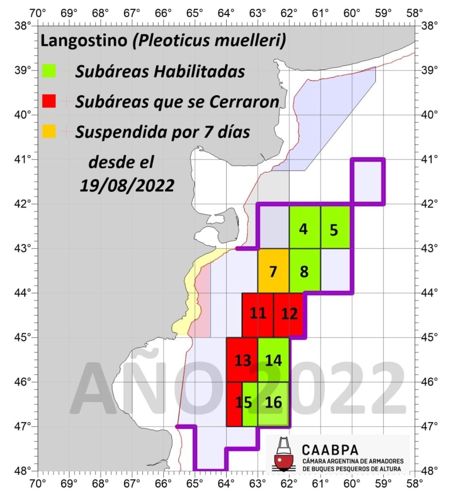 Después de conocerse los datos del relevamiento de la subárea 5 por parte de los observadores a bordo de los 5 buques que participaron en la prospección desde el día 18 del corriente, analizados esos datos por el INIDEP, el Director Nacional de Control y Fiscalización Pesquera Dr. Julián Suarez, ayer a la tarde, envió nota al referente de la autoridad de tráfico marítimo de la Prefectura Naval Argentina, PM Néstor A. Kiferling, informando la apertura a la pesca comercial en el área circunscripta por los paralelo 43°S y 44°S y los meridianos 60°W y 61°W.