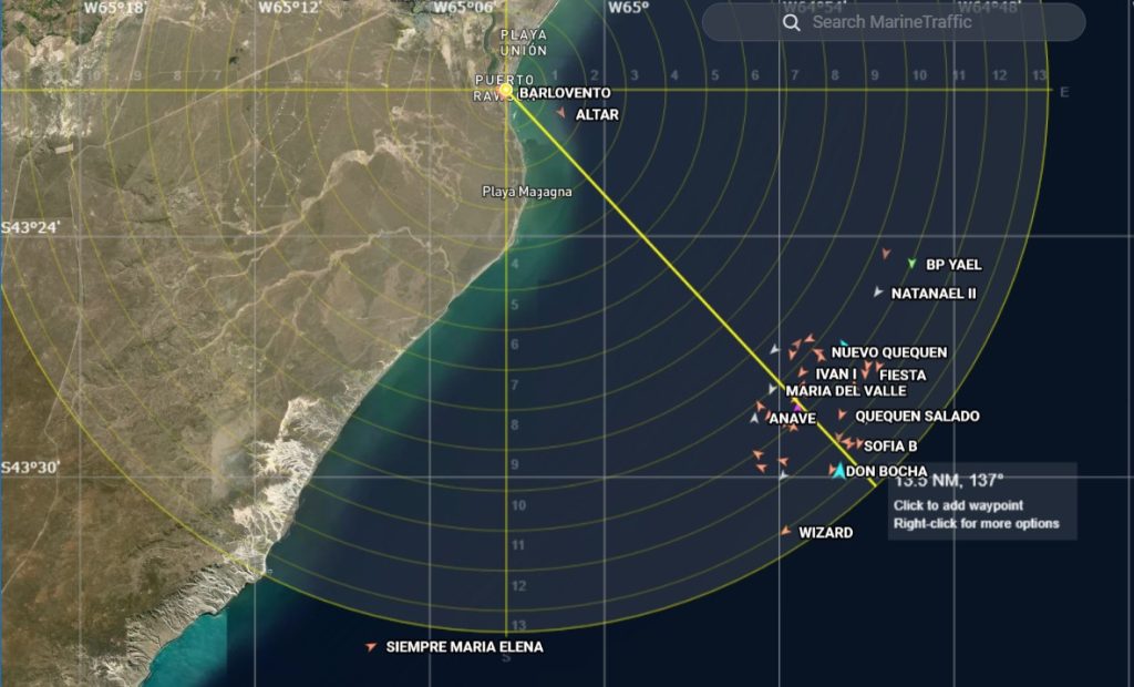 La flota amarilla se encuentra pescando a no más de 13.5 millas al Sudeste de Rawson sobre una marca que todos los años llega a esas costas generando por sobre todo trabajo y desarrollo para el complejo langostinero de Chubut.