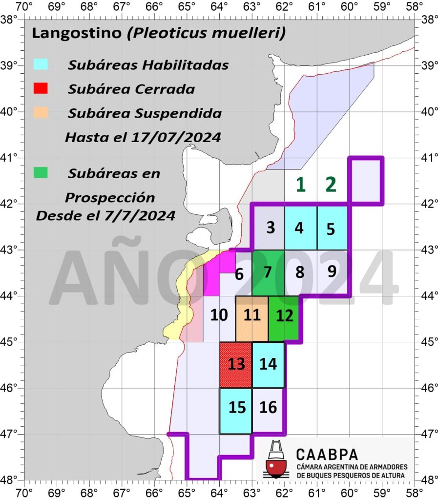 La prospección dará inicio el domingo 7 de julio próximo. Se autoriza la entrada de los buques designados a cada subárea a partir de las 0:00 horas del primer día habilitado, para facilitar la actividad de búsqueda ecoica de concentraciones de langostino. Las operaciones de pesca comenzarán a las 7:00 horas y estarán divididas en 8 buques congeladores y 4 fresqueros por subáreas.