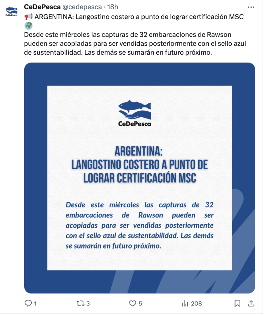 Elba Brunetti, directora de CeDePesca para Argentina, manifestó su profunda satisfacción ante este avance: “Después de casi 10 años de trabajar junto a nuestros socios en el proceso de mejoras de la pesquería costera de langostino en aguas de Chubut, es un gran paso el que se ha dado y estamos a las puertas de alcanzar la anhelada certificación bajo el estándar de sostenibilidad pesquera del MSC, el cual a su vez refleja los lineamientos del Código de Conducta para la Pesca Responsable de la FAO”.