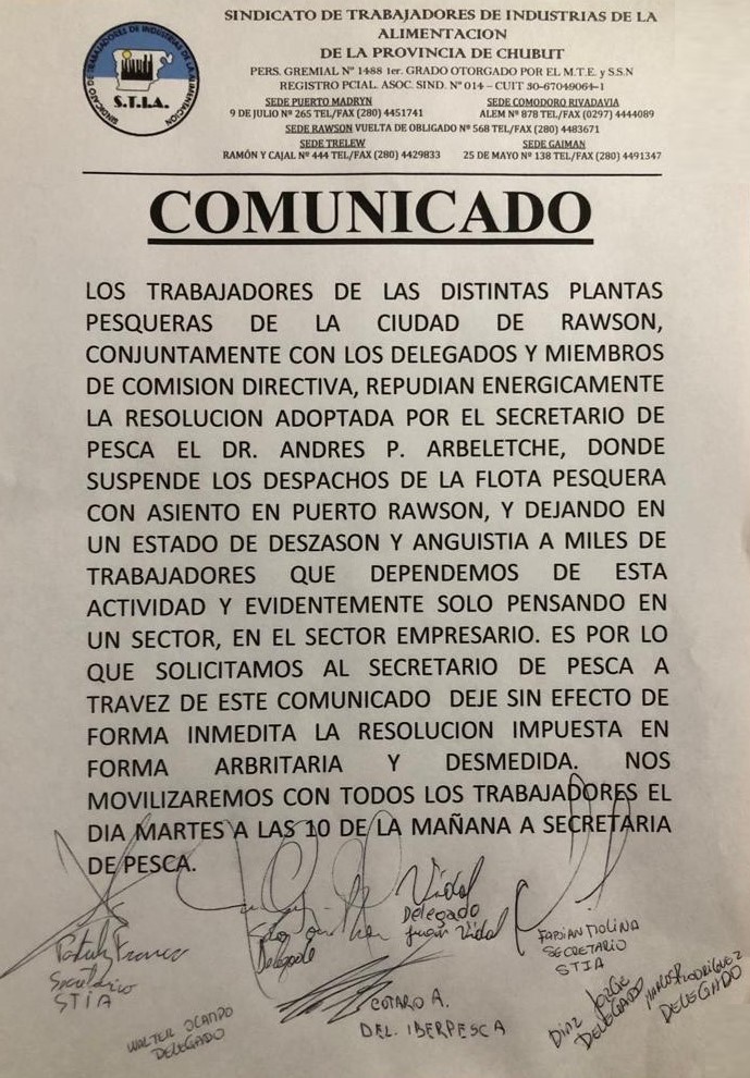 “Los trabajadores de las distintas plantas pesqueras de la ciudad de Rawson, conjuntamente con los delegados y miembros de la comisión directiva, repudian enérgicamente la resolución adoptada por el secretario de pesca el Dr. Andrés P. Arbeletche, donde suspende los despachos de la flota pesquera con asiento en puerto Rawson, y dejando en un estado de desazón y angustia a miles de trabajadores que dependemos de esta actividad y evidentemente solo pensando en un sector, en el sector empresario.