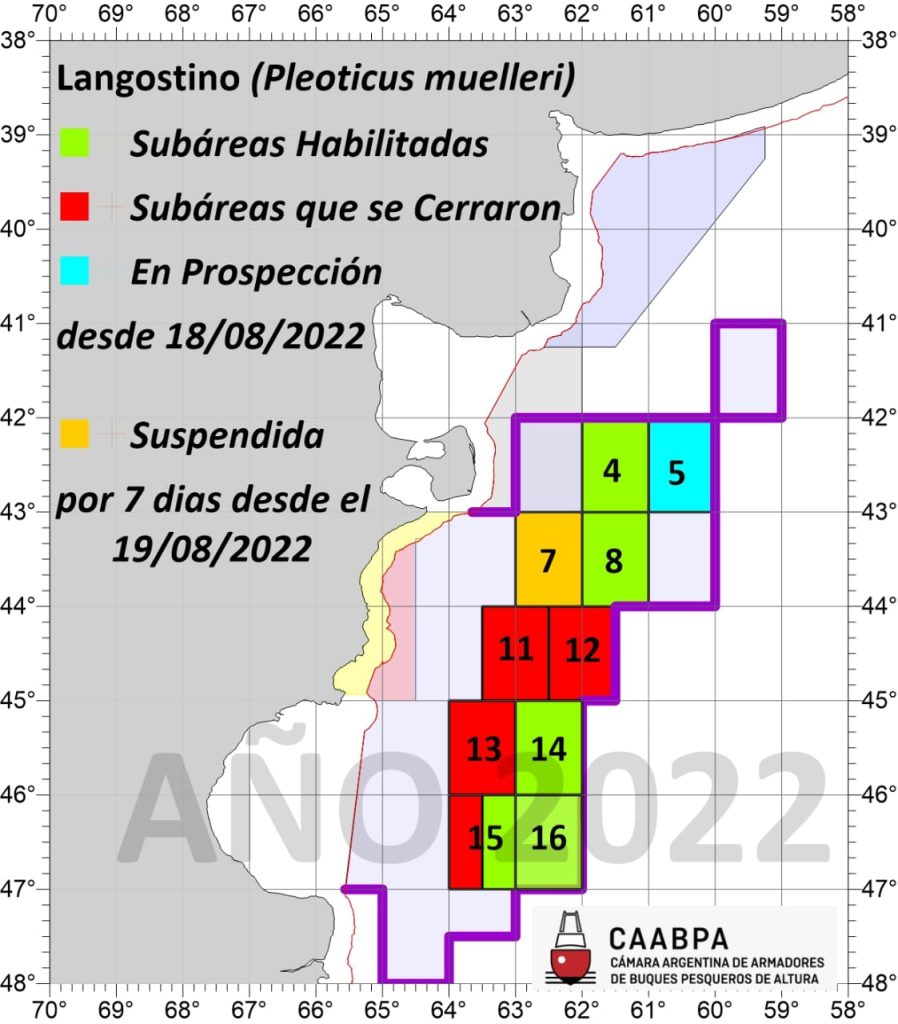 Con motivo de un informe llegado a la dependencia de la Subsecretaria de Pesca por el INIDEP informando tallas menores de langostino en calidad L4, L5 y menores; la Dirección Nacional de Control y Fiscalización Pesquera por intermedio de su Director Dr. Julián Suarez, emitió una nota correspondiente a la SUSPENSION de la subárea 7, circunscripta entre los paralelos 43°S-44°S y los meridianos 62°W-63°W.