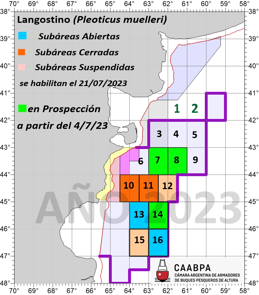 Con la respectiva información brindada al Departamento Policía Auxiliar Pesquera, a cargo del Prefecto Principal Ángel Oscar Alvarenga, y comunicada a las autoridades de competencia en la medida, la misma es en relación a la Zafra de Langostino (Pleoticus Muelleri) en aguas nacionales dentro del Área de Veda Permanente de Juveniles de Merluza (AVPJM).