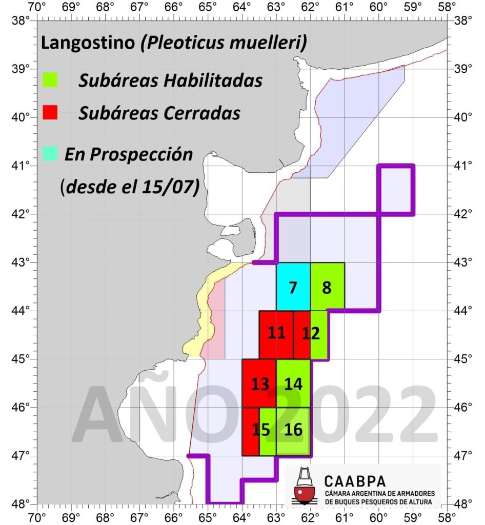 En la comunicación correspondiente al Jefe de Tráfico Marítimo, Fluvial y Lacustre de la Dirección General de Seguridad de la Prefectura Naval Argentina, Prefecto mayor Néstor Alberto Kiferling, el organismo informó la decisión de autorizar una nueva prospección de langostino para el presente a año, tras el informe pertinente del INIDEP, de acuerdo al siguiente detalle: