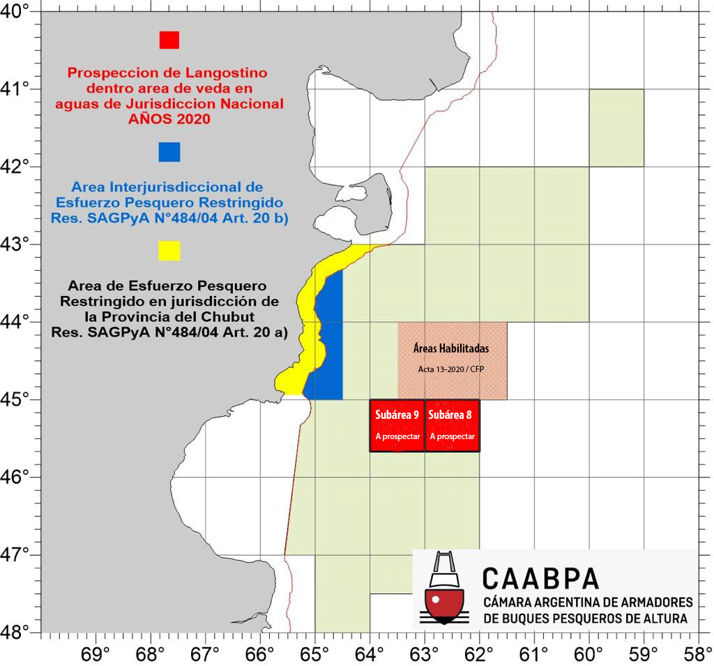 Se trata de la zona ubicada entre los paralelos 45° y 45°40’ S y los meridianos 62° y 64° W. El trabajo fue dividido en dos subáreas dentro de la Zona de Veda Permanente de Merluza: la 8, entre 45° y 45°40´ S y entre 62° y 63° O; y la 9, entre 45° y 45°40´ S y 63° y 64°´O.