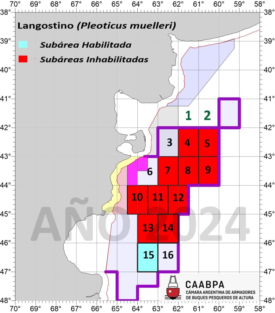 De este modo, el propio Subsecretario de Recursos Acuáticos y Pesca MV Juan Antonio López Cazorla, mediante nota NO-2024-100176156-APN-SSRAYP%MEC dispuso el cierre para la pesca comercial de Langostino (Pleoticus muelleri) en la subárea 4, delimitada entre las latitudes 42°00’S y 43°00’ S y las longitudes 61°00’W y 62°00’W, y en la Subárea 11 delimitada entre las latitudes 44°00’S y 45°00’ S y las longitudes 62°30’W y 63°30’W a partir de las 00 Hs de este día lunes 16 de septiembre del corriente.