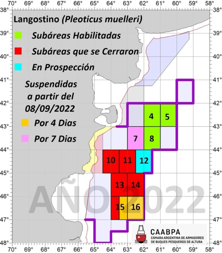 Sobre la misma tarde de hoy, algunos capitanes en zona de pesca quedaron con un panorama algo confuso, habida cuenta de prospecciones, cierres y suspensión de algunas zonas por 4 y 7 días -tal lo informado con la nota anterior-. El dinamismo sobre esta etapa de la zafra donde ya la presencia de merluza, que históricamente en el mes de septiembre empieza a aparecer mezclada en algunas concentraciones escasas de langostino, pone a prueba la sintonía fina de la administración. Por otro lado, el mal tiempo también juega un papel preponderante respecto al bycatch. Con mar movido después de 3/4 días, los resultados de los observadores a bordo pueden no ser certeros, de esa manera se prefiere suspender antes de cerrar definitivamente una subárea.