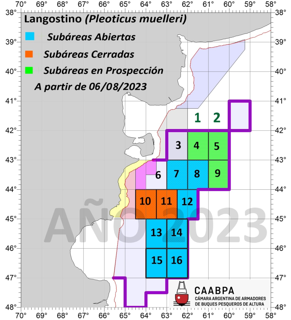 Cambios en la prospección de Langostino en las subáreas 4, 5 y 9 dentro del Área de Veda Permanente de Juveniles de Merluza. Lo comunicó en la tarde del sábado la Dirección Nacional de Coordinación y Fiscalización Pesquera.