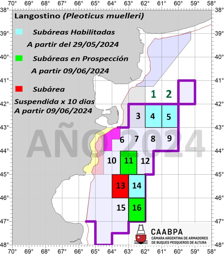 - Subárea 16, delimitada por las latitudes 46° y 47°S y las longitudes 62° y 63°W.