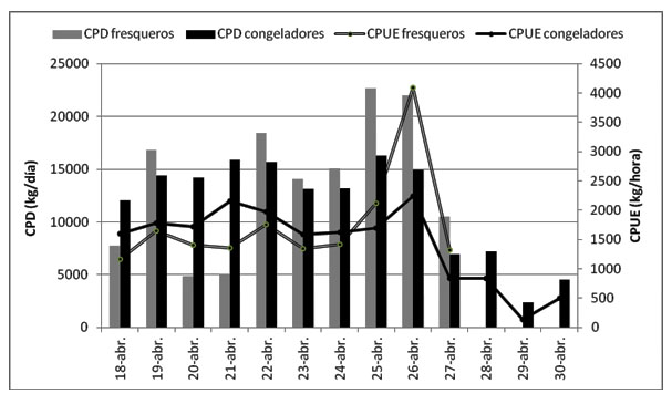 “Considerando los dos estratos de flota, las capturas promedio de langostino por día (CPD) fluctuaron entre 2.340 y 16.616 kg”, apunta el trabajo; aunque del 28 al 30 de abril los rendimientos bajaron considerablemente por las condiciones climáticas adversas.