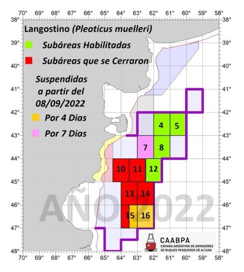 Sobre el mediodía de este domingo, la Dirección Nacional de Coordinación y Fiscalización Pesquera, mediante un comunicado, informó la apertura de la Subárea 12 para la pesca de Langostino (Pleoticus muelleri), que se encuentra dentro del Área de Veda Permanente de Juveniles de Merluza.