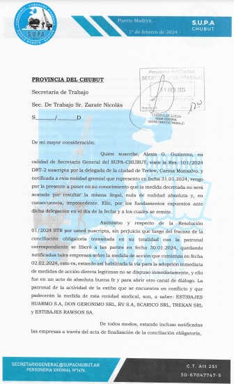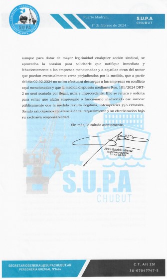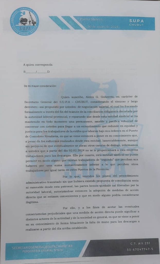 “Quien suscribe, Alexis G. Gutiérrez, en carácter de Secretario General del S.U.P.A CHUBUT, considerando el sinuoso y largo derrotero -así propuesto por ustedes de negociación salarial, el cual ha fracasado formalmente a través del fin del trámite de la conciliación obligatoria decretada por la autoridad laboral provincial, y reparando que desde esta entidad sindical se ha mantenido en todo momento una permanente, amable y pacífica voluntad de conversar con ustedes para llegar a un entendimiento que redunde en equidad y justicia para los trabajadores de la estiba que laboran bajo sus órdenes en el Puerto de Comodoro Rivadavia, es que se viene entonces a poner en su conocimiento que, a pesar de los esfuerzos realizados desde esta entidad, lamentablemente, aunque sin perjuicio de que eventualmente se abran otros canales de diálogo, informamos a ustedes que a partir del día 02.02.2024 no se le proporcionará a esta empresa trabajadores para las descargas. Ello por cuanto, esta entidad sindical no puede permitir en modo alguno que existan trabajadores de ‘segunda’ que perciban sus haberes por una suma sustantivamente inferior a lo que perciben otros trabajadores por igual tarea en otros Puertos de la Provincia.
