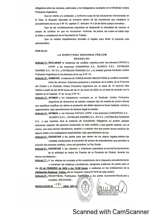Dice lo resuelto que se deben someter a instancia de Conciliación Obligatoria al conflicto suscitado entre las cámaras, empresas pesqueras y empresas de la estiba, de la Provincia del Chubut y el Sindicato Unidos Portuarios Argentinos por un plazo de 15 días hábiles a partir de las 00:00 horas del día 31 de enero de 2024. Así se expresa en el escrito.