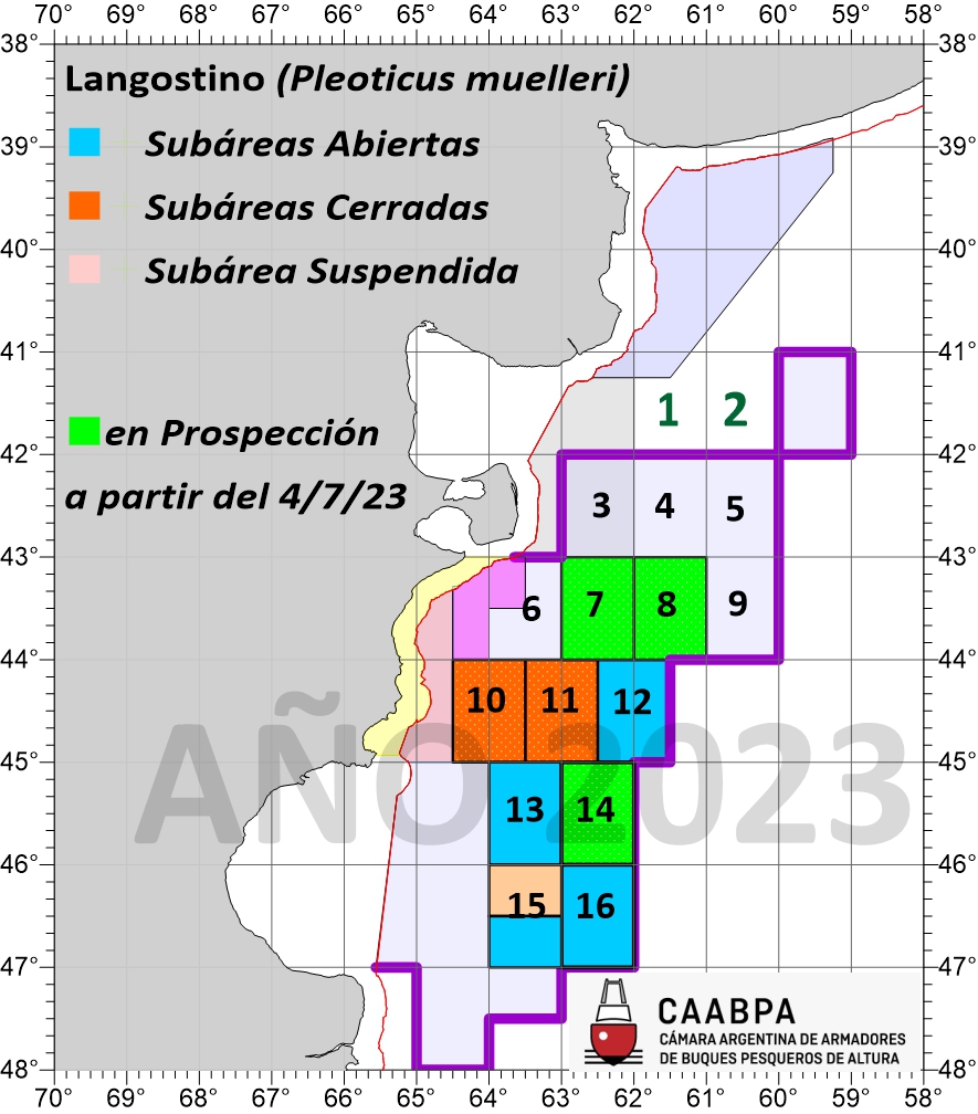 Las tareas tendrán una duración de cuatro días efectivos de pesca para los buques congeladores y tres días efectivos de pesca para los buques fresqueros, dando inicio este a la misma este martes 4 de julio, autorizándose el ingreso a cada subárea a la hora 00:00 del mismo, para de ese modo facilitar la actividad de búsqueda ecoica de concentraciones de langostino. En tanto las operaciones podrán comenzar a la hora 7.
