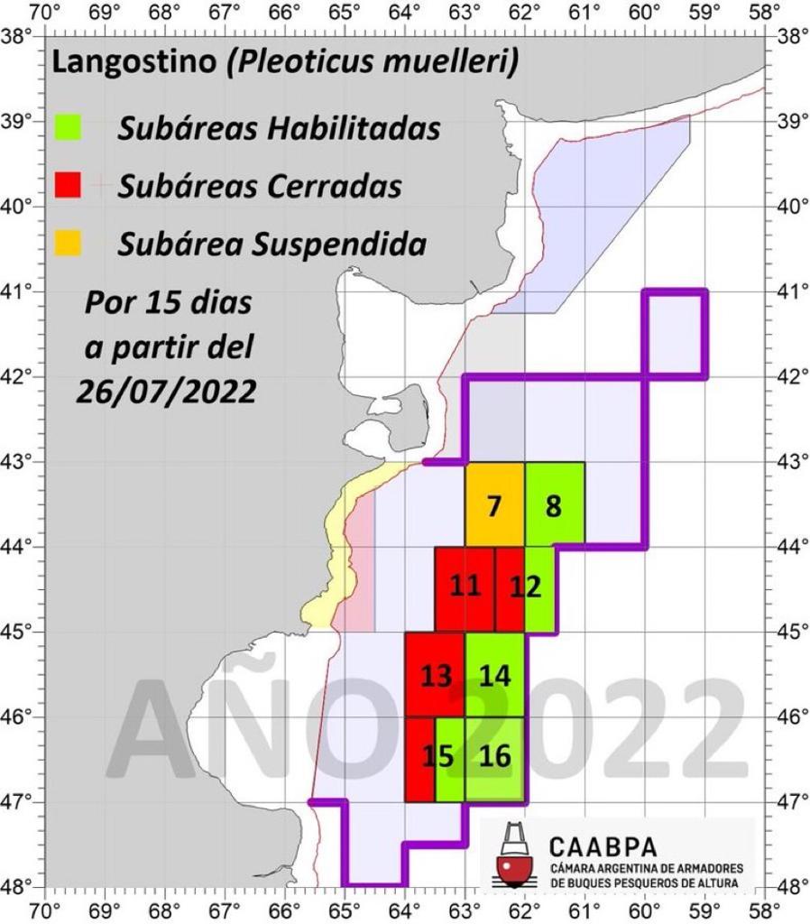 En virtud del informe del INIDEP, es que la mencionada Dirección decidió disponer la suspensión a la pesca comercial de langostino por el lapso de 15 días en el subárea nro. 7, que se encuentra delimitada entre las latitudes 43° 00’ y 44° 00’ S y los meridianos 62°00’ y 63°00’ O, a partir de este último martes 26 de julio.