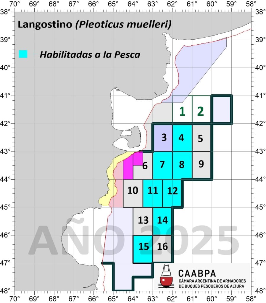 Imágen de áreas abiertas y operativas a la pesca de langostino, gentileza Dr.Diego García Luchetti, CAABPA.