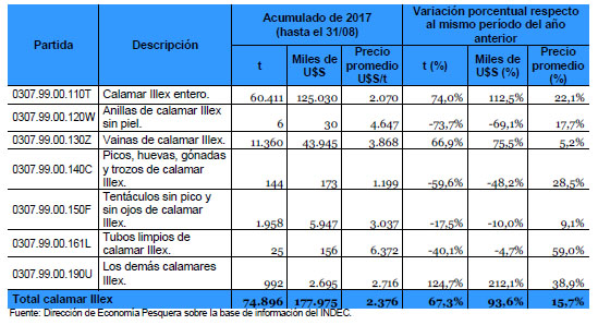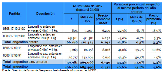 En el caso particular del langostino, explica más de la mitad de esas divisas generadas. Durante los primeros ocho meses se comercializaron 106.166 toneladas a cambio de 685,4 millones; mientras que salieron 74.896 toneladas de illex por 177,9 millones.