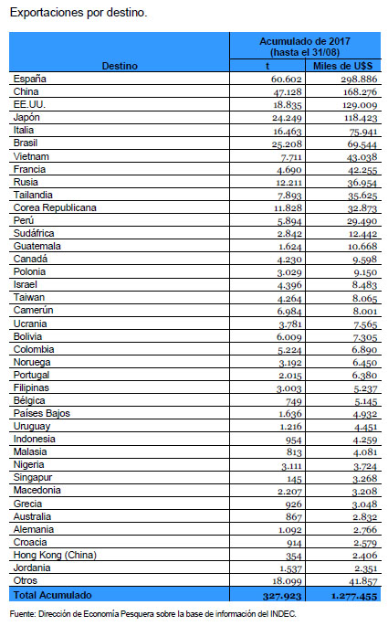 En cuanto a los principales destinos, se mantiene el predominio de España y China. Más atrás aparecen Estados Unidos, Japón, Italia, Brasil (perdiendo terreno), Vietnam, Francia y Rusia, entre otros.