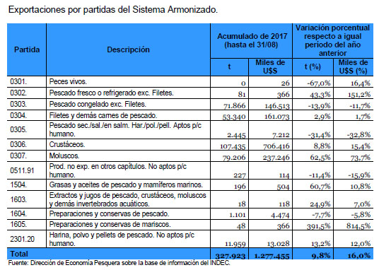 Los últimos datos disponibles exponen que entre enero y agosto se enviaron 327.923 toneladas de pescados y mariscos a cambio de 1.277 millones de dólares. Esto implica un aumento interanual del 9,8 y del 16 por ciento respectivamente.
