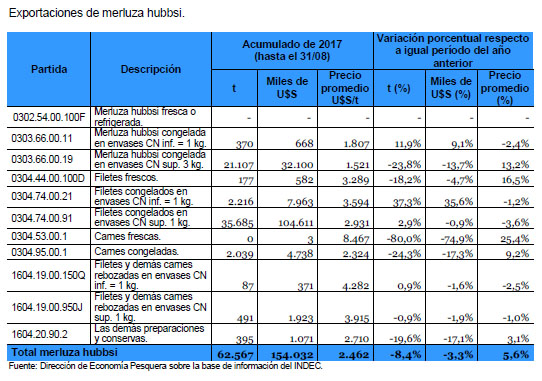 Más modesto es el escenario para merluza hubbsi. Entre enero y agosto se exportaron 62.567 toneladas por 154 millones. Con precios en baja, se verá durante las próximas mediciones si la mejora de los reintegros genera algún efecto dinamizador.