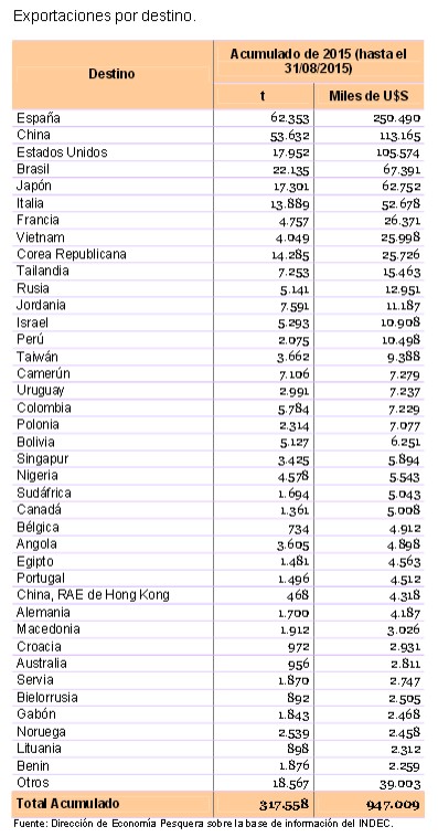 Entre enero y agosto se registraron envíos por 317.558 toneladas de pescados y mariscos a cambio de 947 millones de dólares, números que equivalen a una caída interanual de 6,4 y 3 por ciento respectivamente.