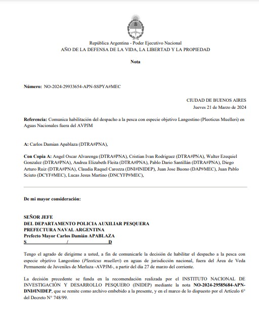 “Tengo el agrado de dirigirme a usted, a fin de comunicarle la decisión de habilitar el despacho a la pesca con especie objetivo Langostino (Pleoticus muelleri) en aguas de jurisdicción nacional, fuera del Área de Veda Permanente de Juveniles de Merluza -AVPJM-, a partir del día 27 de marzo del corriente.”