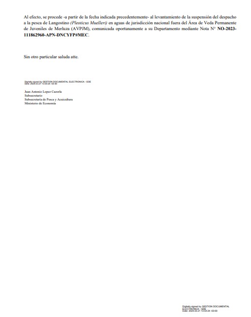 “Al efecto, se procede -a partir de la fecha indicada precedentemente- al levantamiento de la suspensión del despacho a la pesca de Langostino (Pleoticus Muelleri) en aguas de jurisdicción nacional fuera del Área de Veda Permanente de Juveniles de Merluza (AVPJM), comunicada oportunamente a su Departamento mediante Nota N° NO-2023- 111862960-APN-DNCYFP#MEC.”